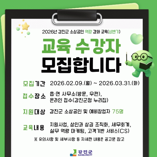 강진군은 이번 교육을 통해 소상공인이 장사에 대한 두려움을 줄이고, 스스로 가게를 더 잘 운영할 수 있는 힘을 기를 수 있을 것으로 기대하고 있다. 특히 교육을 끝까지 수료한 사람에게는 2027년 소규모 경영환경 개선 지원사업 신청 시 가산점 혜택도 주어질 예정이다.