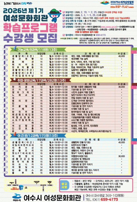 여수시에 거주하는 시민은 누구나 1인당 2과목까지 신청할 수 있으며 여수시 누리집 ‘OK통합예약시스템’ 내 교육/강좌에서 여성문화회관 교육을 신청하면 된다.