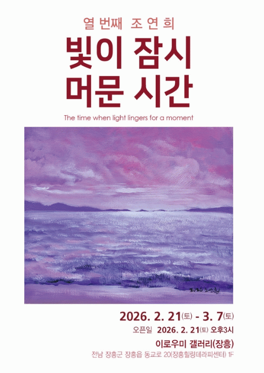 은은한 차 한 잔과 책, 그리고 바다의 잔상이 어우러진 공간에서 작가의 작품 세계를 더욱 깊이 있게 음미할 수 있을 것으로 보인다. 전시는 장흥힐링테라피센터 1층에 위치한 이로우미 갤러리에서 누구나 무료로 관람할 수 있다.