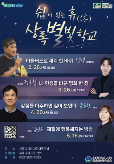 김선아 도서관과장은 “상록별빛학교는 단순한 강연을 넘어 주민이 스스로를 돌보고 쉼을 경험하도록 기획한 프로그램”이라며 “책과 사람, 이야기가 만나는 상록별빛학교에 많은 관심과 참여를 바란다”고 말했다.