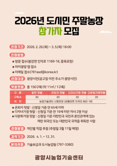 신청 대상은 공고일 이전 주민등록상 주소지가 광양시인 시민이며, 참가비는 1만 원이다. 올해는 ▲일반텃밭 90구획 ▲은퇴자텃밭 20구획 ▲다자녀가정 텃밭 20구획 ▲다문화가정 텃밭 20구획 등 총 150구획을 운영한다.