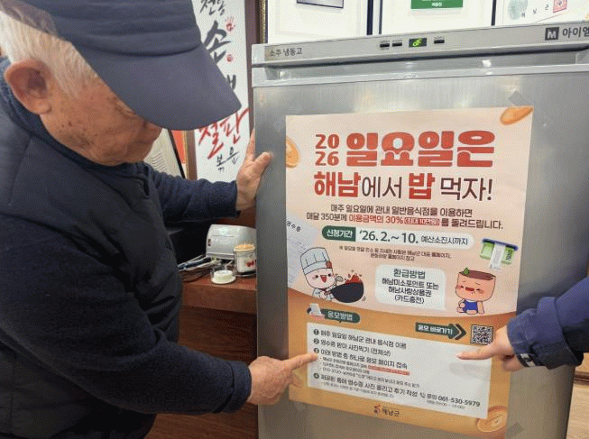 한편 해남군은 이번 사업의 성공적인 안착을 위해 관내 일요일 영업 음식점 업주들의 적극적인 협조를 요청했다. 군 관계자는“식당을 찾는 손님들이 이 혜택을 놓치지 않도록 계산대나 식탁에 홍보물을 비치하는 등 적극적인 안내를 부탁드린다”며, “업주분들의 친절한 서비스와 홍보가 더해진다면 일요일 외식 문화가 정착되어 침체된 골목상권이 다시 살아나는 계기가 될 것”이라고 전했다.