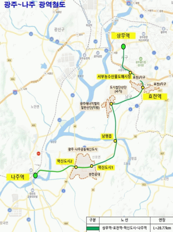 광주~나주 광역철도는 총사업비 1조 7천억 원을 투입해 광주 상무역을 출발해 효천역~도시첨단산단~남평읍~광주전남공동혁신도시를 거쳐 나주역까지 총연장 28.77㎞를 연결하는 사업이다.