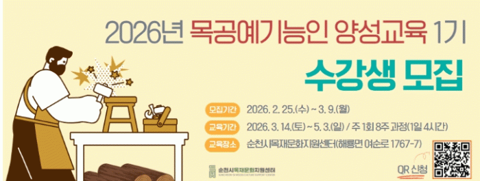 교육은 3월 14일부터 순천시목재문화지원센터에서 진행되며 토·일요일 중 하루 4시간씩, 주 1회, 총 8주간 운영된다.