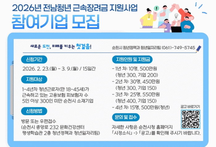 전남 청년 근속장려금 지원사업은 도비 보조사업으로 중소기업 등에 정규직으로 취업해 근속 중인 청년 80명과 해당 청년을 채용 및 고용하고 있는 기업에 4년간 최대 2,000만원(청년 1,500, 기업 500)을 지원하는 사업이다.