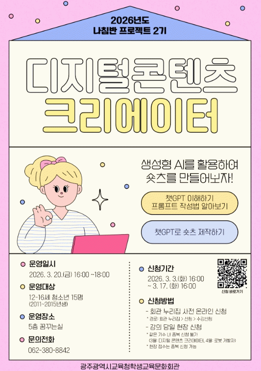학생교육문화회관 정은남 관장은 “이번 프로그램을 통해 청소년들이 자신의 적성을 발견하고 창의적 사고를 확장하길 바란다”며 “청소년들의 많은 관심과 참여를 기대한다”고 말했다.