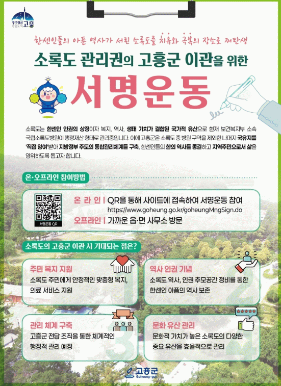 이를 통해 방치되거나 훼손되는 문화유산과 환경 자원을 효율적으로 보존하고, 소록도 주민에게 다양한 복지·행정 서비스를 신속히 제공해 안정적인 삶을 뒷받침하기 위해 서명운동을 추진하게 됐다.