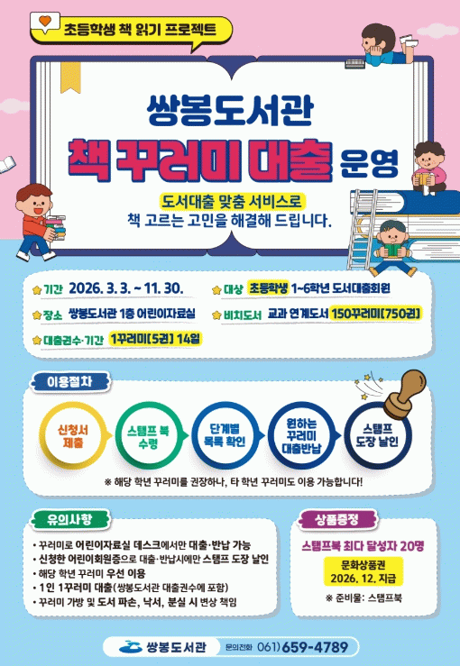 참여 대상은 여수시립도서관 도서대출 회원인 초등학생으로 쌍봉도서관 1층 어린이자료실을 방문해 도서대출회원증 제시 후 참여 신청서를 작성하고, 스탬프 북을 받으면 원하는 꾸러미를 대출할 수 있다.