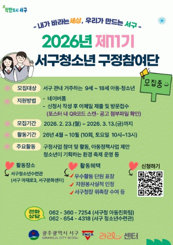 서구는 3월13일까지 서구에 거주하거나 관내 학교에 재학 중인 9세부터 18세까지 아동·청소년 80명을 모집한다. 참여를 희망할 경우 서구청소년수련관 누리집의 관련 서류를 준비해 서구청 양성아동복지과에 방문하거나 전자우편으로 제출하면 된다. 네이버폼으로도 신청 가능하다.