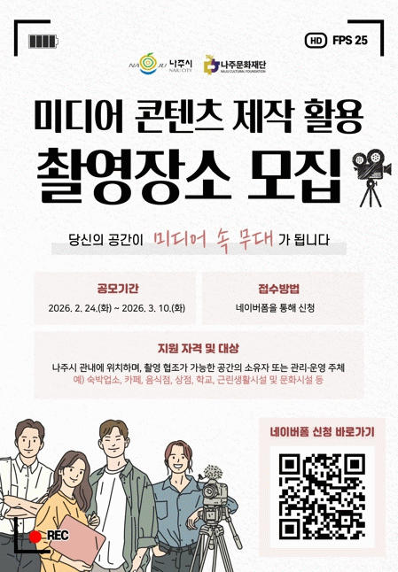 나주문화재단은 지역 자원의 효과적인 홍보와 소상공인 지원을 위해 ‘미디어 콘텐츠 촬영 장소’를 오는 3월 10일까지 공개 모집한다고 26일 밝혔다.
