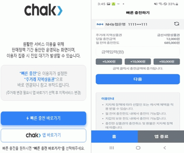 원활한 이용을 위해서는 판매 개시 1~2일 전까지 ‘chak’ 앱에서 여수사랑상품권을 ‘주거래 상품권’으로 설정해야 한다. 이를 설정하지 않을 경우 빠른 충전 버튼을 눌러도 기존 메인 화면으로 이동돼 대기 시간이 길어질 수 있다.
