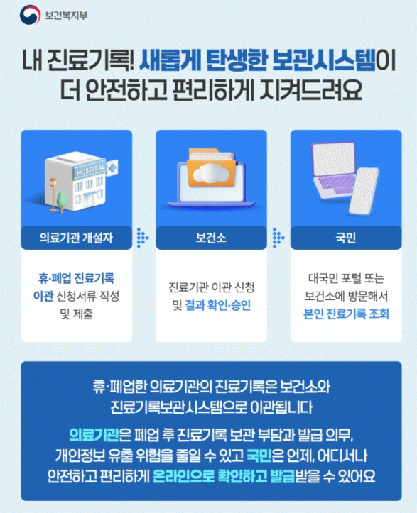 휴·폐업 의료기관 진료기록보관시스템은 병·의원이 문을 닫아도 환자의 진료기록을 안전하게 보관하고, 필요시 온라인으로 열람하거나 사본을 발급받을 수 있도록 지원하는 서비스다.