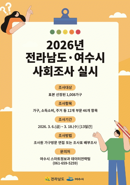 이번 조사는 여수시에 거주하는 만 15세 이상 가구주·가구원을 대상으로 하며, 표본으로 선정된 1,008가구를 대상으로 진행한다. 조사 내용은 가구·가족, 소득·소비, 노동, 환경, 안전 등 총 12개 부문이다.