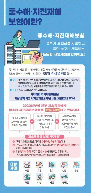 태풍, 홍수, 호우, 강풍, 풍랑, 해일, 대설, 지진, 8개 재해를 보장한다. 주택·온실 소유자와 세입자, 상가나 공장을 소유한 소상공인이라면 누구나 가입할 수 있다.