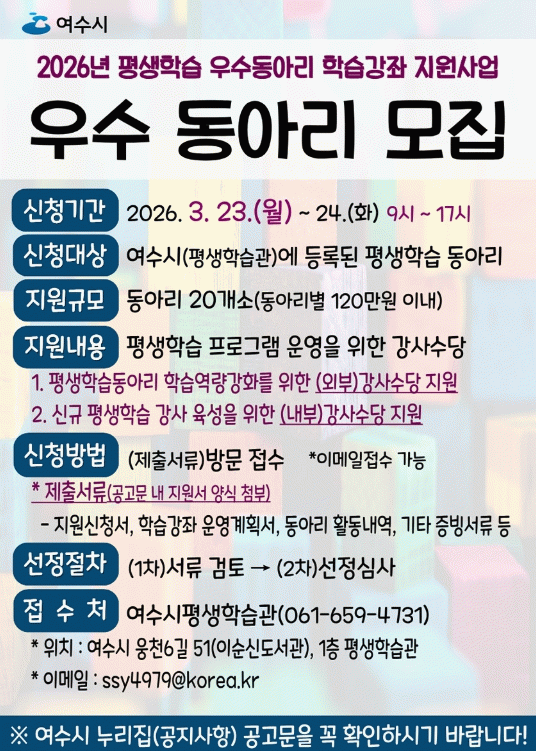 모집 대상은 여수시 평생학습관에 등록된 동아리로, 월 2회 이상 정기적인 학습활동을 하고 회원 수 10명 이상으로 구성된 단체이다.
