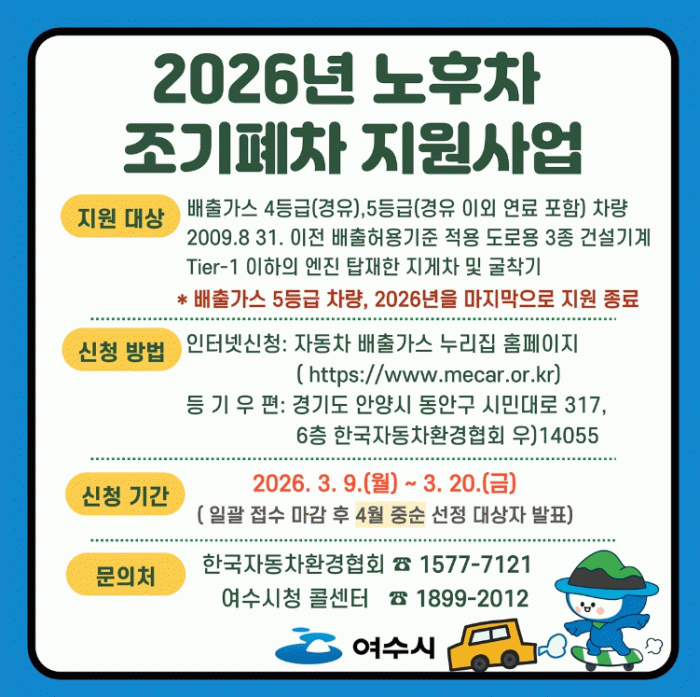 올해부터 지원 요건이 강화돼 차량의 사용본거지가 여수시에 6개월 이상 등록돼 있고 소유기간 또한 6개월 이상이어야 하며, 정부나 지자체 지원을 통한 배출가스 저감장치 부착 또는 저공해 엔진 교체 이력이 없어야 한다.