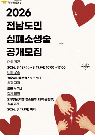 최민철 전남소방본부장은 “심정지 환자의 생존율을 획기적으로 높이기 위해서는 골든타임 내 응급처치가 필수적”이라며 “도민들이 이번 대회를 통해 심폐소생술을 몸소 익히고 생명을 살리는 든든한 이웃으로 거듭나길 기대한다”고 강조했다.