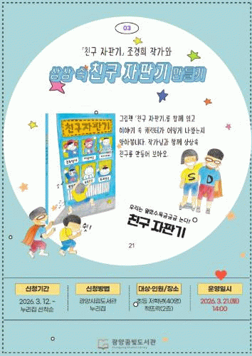참가 신청은 3월 12일 오전 10시부터 광양시립도서관 누리집에서 선착순으로 접수하며, 광양시에 거주하는 초등학생 40명을 대상으로 한다.