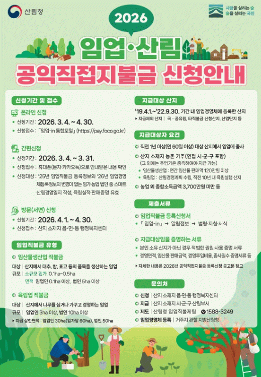 신청은 시기별로 세 가지 방법으로 진행된다. ▲모바일 문자나 카카오톡 안내를 받은 대상자가 신청하는 ‘간편 신청’(3월 4일~3월 31일) ▲‘임업-in 통합포털’을 이용한 ‘비대면 온라인 신청’(3월 4일~4월 30일) ▲산지 소재지 읍·면사무소를 직접 찾는 ‘방문 신청’(4월 1일~4월 30일) 등이다.