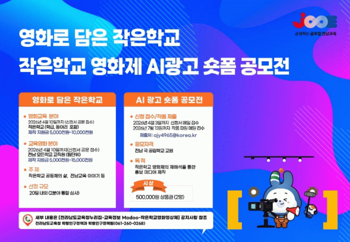 전라남도교육청은 작은학교 교육경쟁력을 높이고 학생들의 창의적 표현 역량을 키우기 위해 글로컬 작은학교 영화 특성화 교육을 추진하고 ‘영화로 담은 작은학교’ 사업과 ‘작은학교 영화제 AI 광고 숏폼 공모전’을 운영한다고 밝혔다.