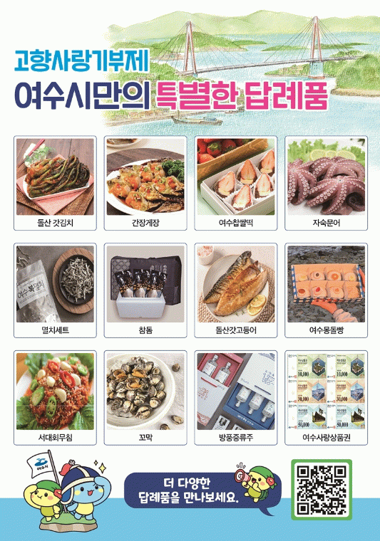 모집 대상은 ▲관광 서비스 ▲농·축·수산물 ▲가공식품 ▲생활용품 등 4개 분야로 여수시에 사업장을 둔 개인사업자·법인·단체 가운데 답례품을 직접 생산하고 배송할 수 있는 업체다.
