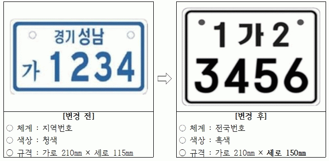 이에 따라 기존 지역번호 체계는 전국번호 체계로 전환하고, 이륜자동차 번호판 규격은 기존 21㎝×11.5㎝(청색)에서 21㎝×15㎝(흑색)로 확대한다. 세로 길이가 3.5㎝ 늘어나면서 원거리에서도 번호 식별이 보다 쉬워질 것으로 전망된다.