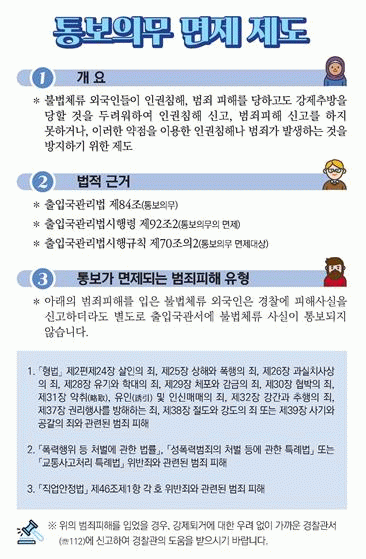 또한, 외국인은 범죄피해를 당하더라도 불법체류 등 강제추방등을 우려해 피해신고를 기피하고 있어 범죄피해 불법체류 외국인 통보의무 면책제도를 현장 대면 홍보 활동으로 적극 홍보하고, 외국인 근로자에 대한 범죄피해 신고 활성화로 불법행위는 끝까지 추적하여 엄정하게 사법처리 할 예정이다.
