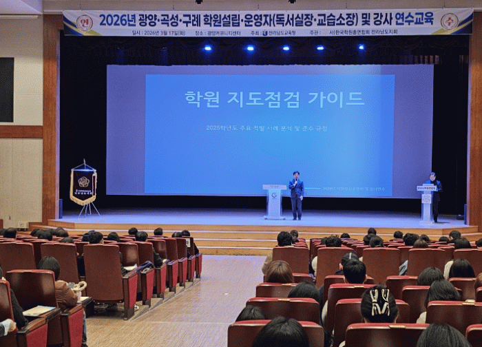 이번 연수는 광양·구례·곡성 지역 학원·교습소·독서실 운영자 1,003명을 대상으로 진행됐으며, 변화하는 교육환경 속에서 학원 운영자의 전문성을 높이고 안전한 교육환경을 조성하기 위해 마련됐다.