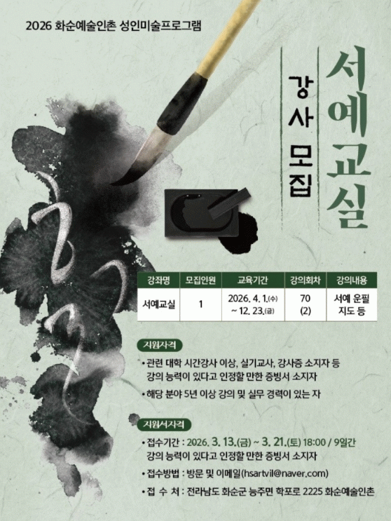 선발된 강사는 오는 4월부터 12월까지 수요일과 금요일 주 2회, 총 70회에 걸쳐 서예 수업을 진행하게 된다.