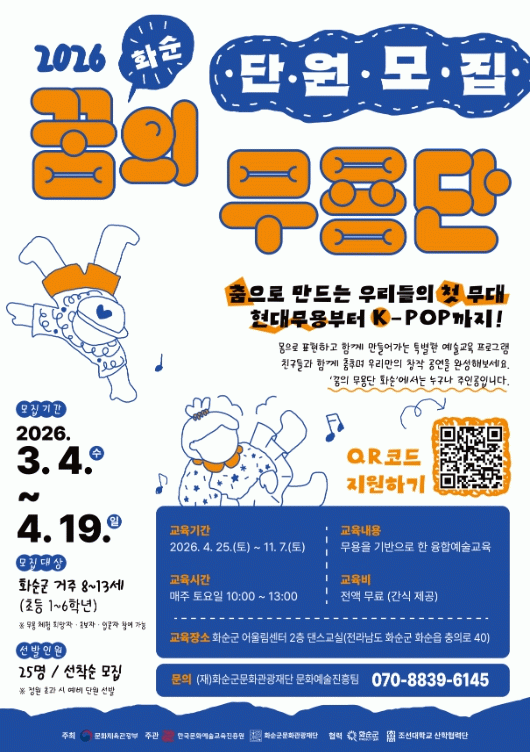 모집 관련 내용은 (재)화순군문화관광재단 누리집에서 확인할 수 있으며, QR코드 또는 온라인 신청 링크를 통해 접수하면 된다.