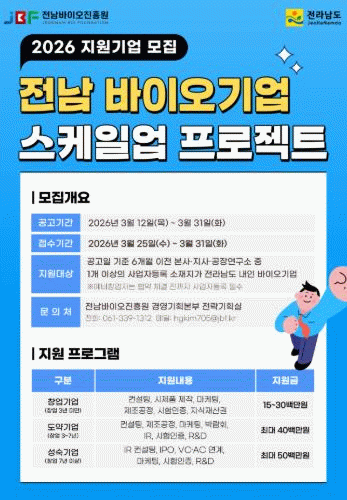 김기홍 전남도 전략산업국장은 “전남은 천연물과 해양생물 등 풍부한 바이오 소재와 화순백신산업특구, 전남바이오진흥원, 화순전남대병원 등 연구·임상 인프라를 갖춘 바이오산업 최적지”라며 “이번 스케일업 프로젝트를 통해 유망 바이오기업을 체계적으로 육성해 전남을 바이오산업의 핵심 성장거점으로 만들겠다”고 말했다.
