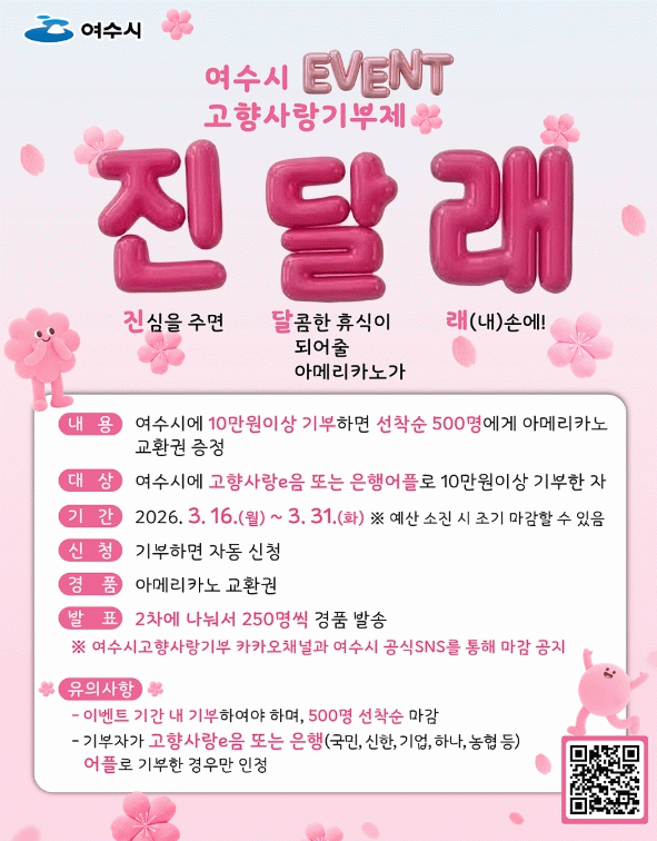 시 관계자는 “진달래가 만개하는 봄을 맞아 많은 분들이 고향사랑기부에 동참해 주시길 바란다”며 “이번 이벤트를 통해 고향사랑기부제가 더욱 활성화되길 기대한다”고 말했다.