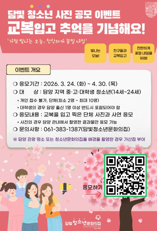 군 관계자는 “청소년들이 친구들과 함께 담양의 다양한 공간에서 사진을 촬영하며 지역의 매력을 자연스럽게 경험하길 바란다”며 “이번 공모전이 소중한 추억을 만들고 지역 문화를 기록하는 의미 있는 기회가 되길 기대한다”라고 전했다.