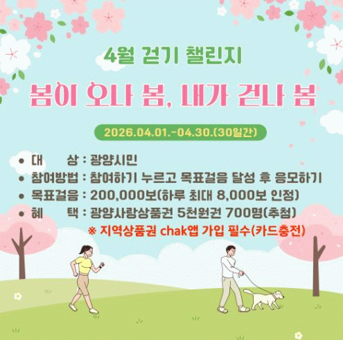 기간 동안 누적 20만 보를 달성한 참여자는 광양사랑상품권 5천 원권 응모 자격이 주어지며, 시는 목표 달성자 가운데 추첨을 통해 700명에게 상품권을 지급할 계획이다.