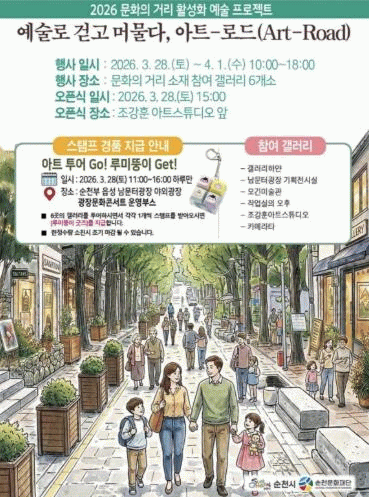 이번 행사는 순천문화재단의 전시 프로젝트 ‘아트-로드’와 문화의 거리 예술축제 ‘금꽃데이’를 연계해 추진하는 통합형 문화행사로, 원도심 일대에 다채로운 문화 콘텐츠를 선보인다.