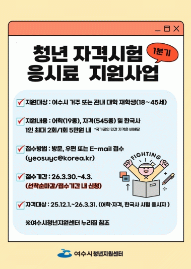 여수시 관계자는 “이번 지원사업이 청년들의 구직 역량을 높이고 취업 준비에 따른 경제적 부담을 덜어주는 데 도움이 되기를 바란다”며 “앞으로도 청년들이 체감할 수 있는 다양한 지원 정책을 지속적으로 추진해 나가겠다”고 밝혔다.