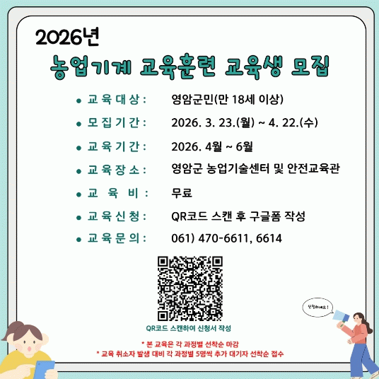 교육 참여를 희망하는 농업인은 QR코드 스캔 후 온라인 신청을 통해 참여할 수 있으며, 온라인 신청이 어려운 경우 전화 또는 방문을 통해서도 신청할 수 있다. 모집 인원이 충족되면 조기에 마감될 수 있다.