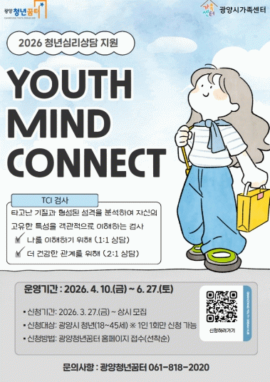참여 대상은 광양시에 거주하는 18세부터 45세까지의 청년으로 누구나 신청할 수 있다. 광양시는 이번 사업을 통해 청년의 심리적 부담을 완화하고 또래 및 가족과의 관계 회복을 돕는 한편 지역 청년의 삶의 질 향상에 기여할 것으로 기대하고 있다.