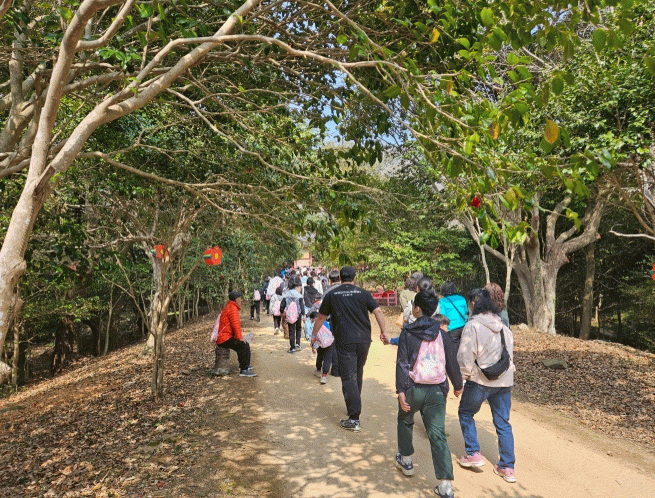 약 1시간 40분 동안 참가자들은 천연기념물로 지정된 만덕산 동백숲의 정취를 만끽했다.