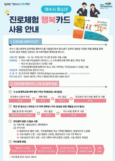 이번 사업은 여수시에 거주하는 중학교 1학년 재학생과 13세 학교 밖 청소년을 대상으로, 1인당 연간 10만 원을 충전식 포인트 카드 형태로 지원한다.
