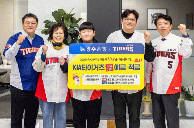 함께 출시된 ‘KIA타이거즈 우승기원 적금’은 월 10만원 이상 100만원 이하까지 1인 1계좌 가입 가능한 정액적립식 상품으로, 우대금리 최고 연 0.25%p와 이벤트 금리 최고 연 1.00%p를 더해 최고 연 3.65%(기본 연 2.40%)의 금리를 제공한다.