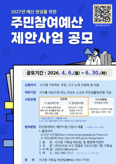 공모는 서구 주민과 서구 소재 사업체 임직원이 참여할 수 있다. 제안은 서구 누리집(구정살림-주민참여예산제-제안사업신청)을 통한 온라인 신청과 우편·전자우편·팩스·방문 접수 등으로 가능하다. 자세한 사항은 서구청 기획실 예산팀(062-360-7799)으로 문의하면 된다.