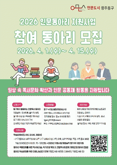 신청 대상은 광주 동구 관내에서 활동하는 청년·직장인·주민 등 5인 이상으로 구성된 소모임이다. 월 1회 이상 정기적으로 모임을 운영해야 하며, 독서 토론·글쓰기·낭독 등 책을 기반으로 한 다양한 활동을 수행하는 동아리면 신청할 수 있다.