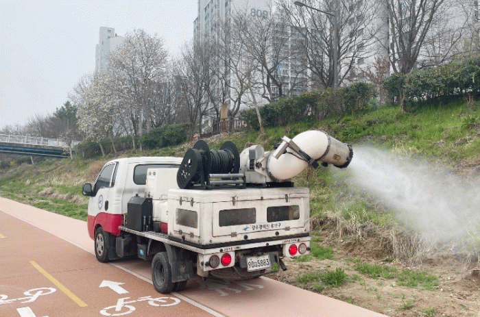 광산구는 14개 전문 민간 업체를 선정, 21개 동 전역을 정기적으로 순회하며, 감염병 매개체 서식이 예상되는 곳을 중점적으로 소독한다.