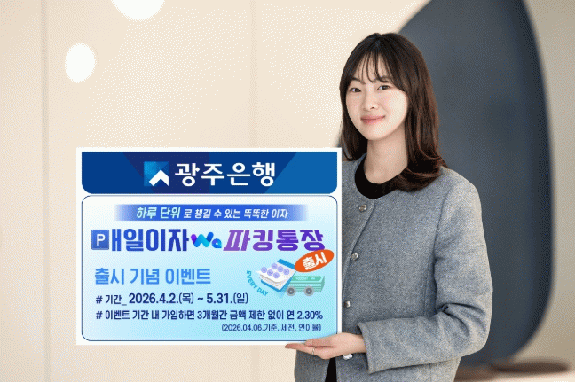 이와 함께 광주은행은 상품 출시를 기념해 추가 우대금리 이벤트도 진행한다. 2026년 4월 2일부터 5월 31일까지 가입한 고객을 대상으로 가입일로부터 3개월 동안 일별 최종 잔액 3천만원 이하 금액에 대해 연 0.50%p(포인트)의 우대금리를 추가 제공한다. 이에 따라 이벤트 기간 내 가입 고객은 가입일로부터 3개월 동안 금액 구간과 관계없이 최대 연 2.30%의 금리를 적용받을 수 있다.