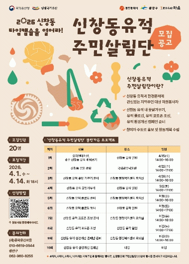 광산구는 ‘신창동 유적 주민살림단’ 클린가든 프로젝트에 참여할 주민 20명을 선착순 모집한다.