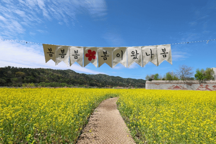 봄을 맞아 유채꽃이 활짝 피면서 바람에 일렁이는 노란 꽃물결과 황룡강의 물빛이 어우러져 한 폭의 그림 같은 풍경을 연출하고 있다.