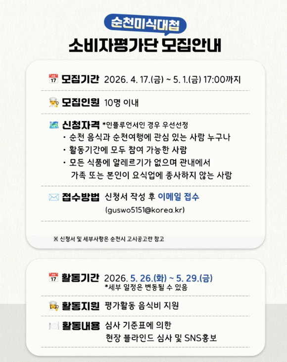 소비자 평가단은 총 10명 이내로 선발되며, 순천 음식과 여행에 관심 있는 사람이라면 누구나 지원할 수 있다.