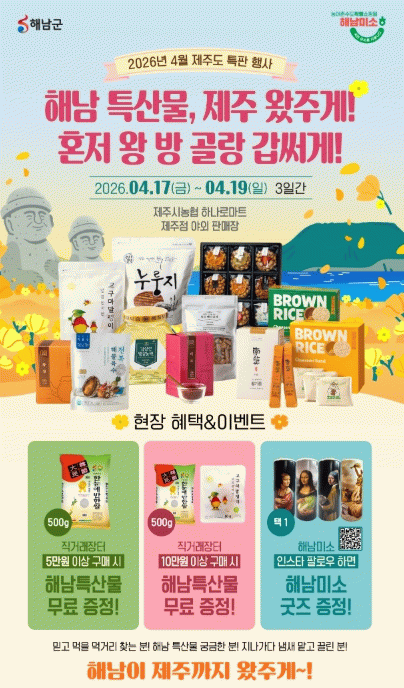 특히 이번 행사에서는 소비자 참여를 높이기 위한 다양한 이벤트도 함께 마련됐다. 행사 기간 동안 5만원 이상 구매 고객에게는 해남 특산물을 증정하며, 10만원 이상 구매 고객에게는 1+1 해남 특산물 추가 증정 혜택을 제공한다. 또한 해남군 SNS 팔로우 시 해남미소 기념품을 증정하는 이벤트를 통해 현장 방문객들에게 즐거움을 더할 예정이다.