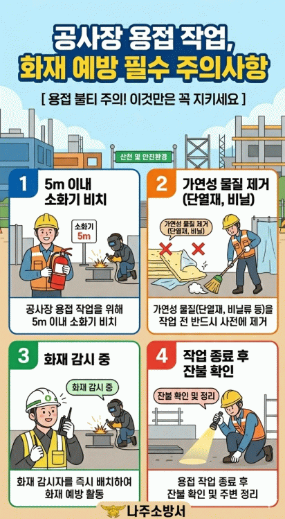 나주소방서는 공사장 관계자들에게 용접・용단 작업 시 작업 반경 5m 이내에는 소화기를 비치, 주변의 단열재나 비닐류 등 가연성 물질을 사전에 제거 또는 안전한 장소로 이동, 화재감시자 배치, 작업 종료후 잔불여부 확인 등 기본 안전 수칙을 철저히 지켜줄 것을 당부했다.